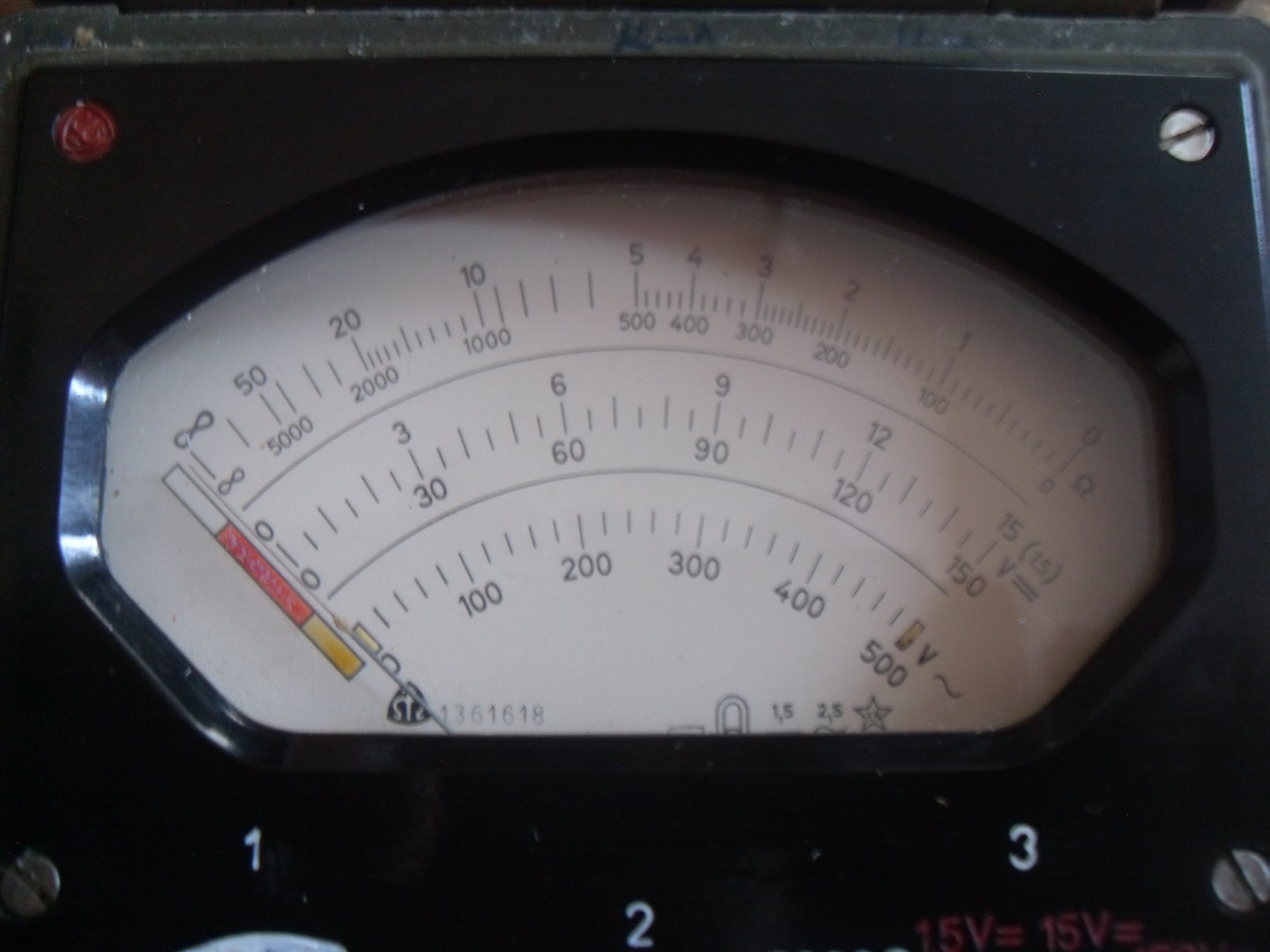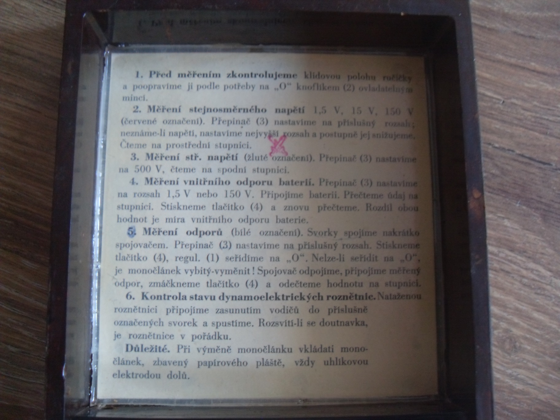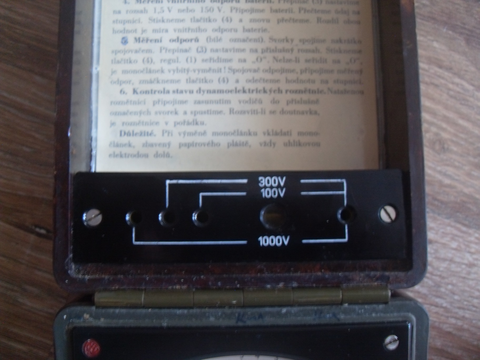 Ručičkový merací prístroj je uložený v spodnej časti skrinky a umožňuje meranie odporu do 50Ω, do 5000Ω, jednosmerného napätia do 1,5V ,15V, 150V, a striedavého napätia do 500V. Pri meraní odporu roznetného vedenia je maximálny merací prúd 1mA.